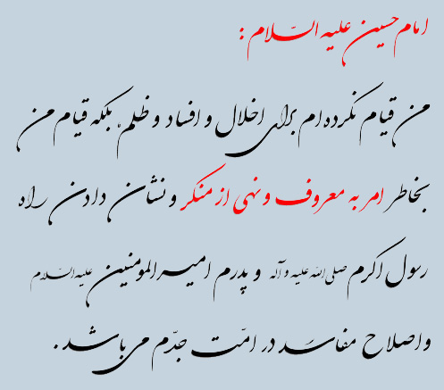 امام حسین (ع ) از همان شبى که از مدینه بیرون آمد, و در تمام مدتى که در مکه اقامت گزید, و در طول راه مکه به کربلا, تا هنگام شهادت , گاهى به اشاره , گاهى به صراحت , اعلان میداشت که : مقصود من از حرکت , رسوا ساختن حکومت ضد اسلامى یزید وبرپاداشتن امر به معروف و نهى از منکر و ایستادگى در برابر ظلم و ستمگرى است وجز حمایت قرآن و زنده داشتن دین محمدى هدفى ندارم . و این مأموریتى بود که خداوند به او واگذار نموده بود, حتى اگر به کشته شدن خود و اصحاب و فرزندان و اسیرى خانواده اش اتمام پذیرد.